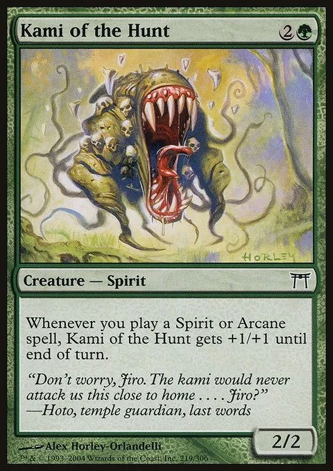 Whenever you cast a Spirit or Arcane spell, Kami of the Hunt gets +1/+1 until end of turn.