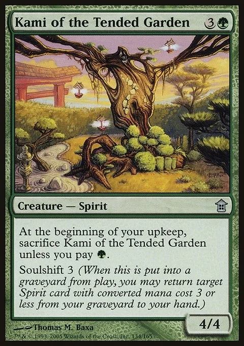 At the beginning of your upkeep, sacrifice Kami of the Tended Garden unless you pay G. Soulshift 3 (When this is put into a graveyard from play, you may return target Spirit card with converted mana cost 3 or less from your graveyard to your hand.)