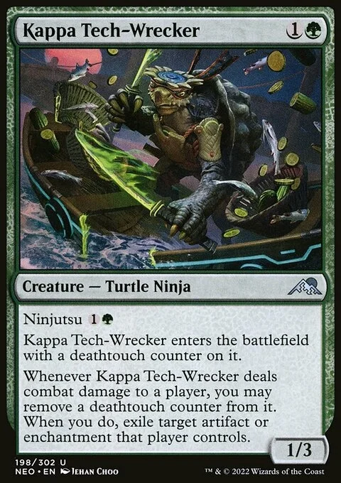 Whenever Kappa Tech-Wrecker deals combat damage to a player, you may remove a deathtouch counter from it. When you do, exile target artifact or enchantment that player controls.