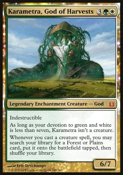 As long as your devotion to green and white is less than seven, Karametra isn't a creature.