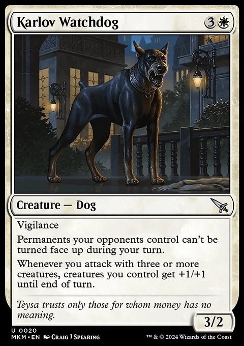 Vigilance Permanents your opponents control can't be turned face up during your turn. Whenever you attack with three or more creatures, creatures you control get +1/+1 until end of turn.