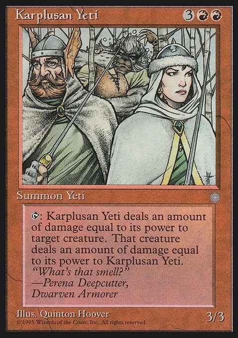 T: Karplusan Yeti deals an amount of damage equal to its power to target creature. That creature deals an amount of damage equal to its power to Karplusan Yeti.