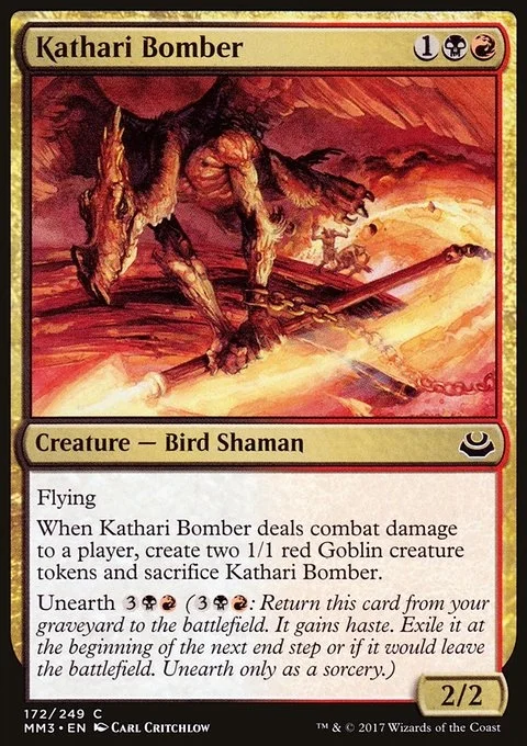 Flying When this creature deals combat damage to a player, create two 1/1 red Goblin creature tokens and sacrifice this creature. Unearth {3}{B}{R} ({3}{B}{R}: Return this card from your graveyard to the battlefield. It gains haste. Exile it at the beginning of the next end step or if it would leave the battlefield. Unearth only as a sorcery.)