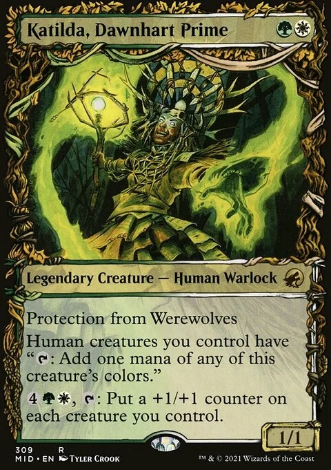 Protection from Werewolves Human creatures you control have "{T}: Add one mana of any of this creature's colors." {4}{G}{W}, {T}: Put a +1/+1 counter on each creature you control.