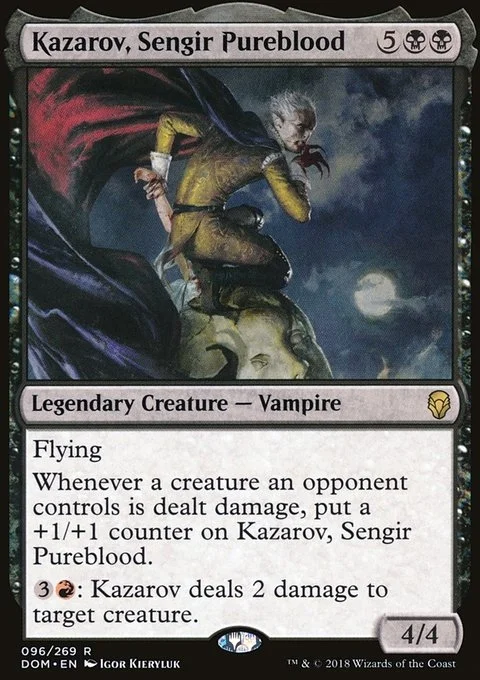 Flying Whenever a creature an opponent controls is dealt damage, put a +1/+1 counter on Kazarov, Sengir Pureblood. {3}{R}: Kazarov deals 2 damage to target creature.