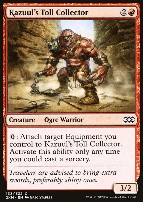 {0}: Attach target Equipment you control to Kazuul's Toll Collector. Activate this ability only any time you could cast a sorcery.
