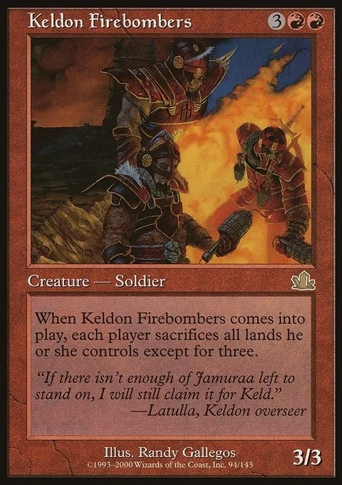 When Keldon Firebombers enters the battlefield, each player sacrifices all lands they control except for three.