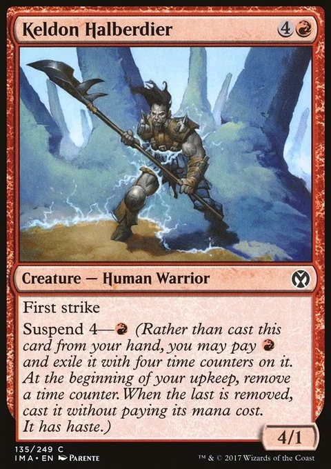 First strike Suspend 4—{R} (Rather than cast this card from your hand, you may pay {R} and exile it with four time counters on it. At the beginning of your upkeep, remove a time counter. When the last is removed, you may cast it without paying its mana cost. It has haste.)