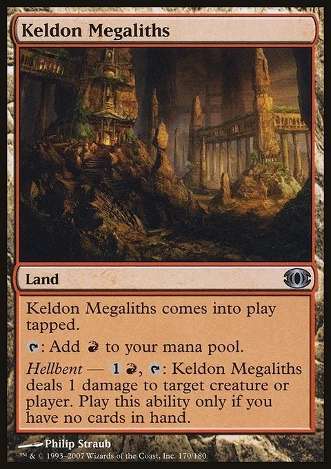 Hellbent — 1R, T: Keldon Megaliths deals 1 damage to target creature or player. Play this ability only if you have no cards in hand.