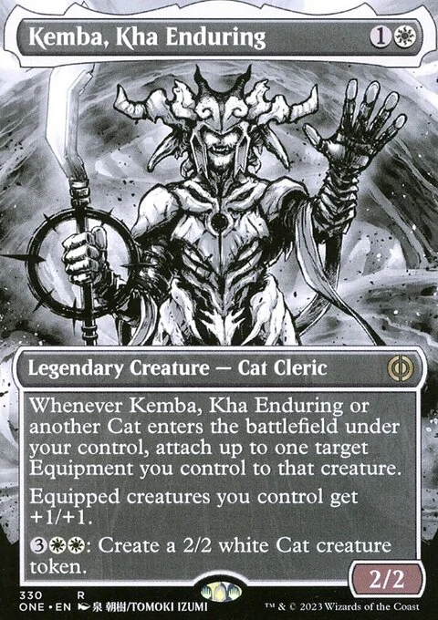 Whenever Kemba or another Cat you control enters, attach up to one target Equipment you control to that creature. Equipped creatures you control get +1/+1. {3}{W}{W}: Create a 2/2 white Cat creature token.