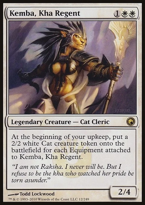 At the beginning of your upkeep, create a 2/2 white Cat creature token for each Equipment attached to Kemba, Kha Regent.