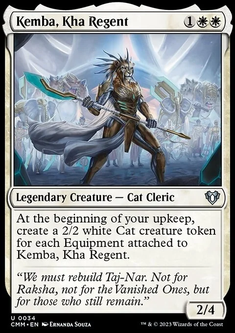 At the beginning of your upkeep, create a 2/2 white Cat creature token for each Equipment attached to Kemba.