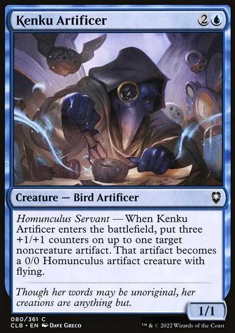 Homunculus Servant — When this creature enters, put three +1/+1 counters on up to one target noncreature artifact. That artifact becomes a 0/0 Homunculus artifact creature with flying.