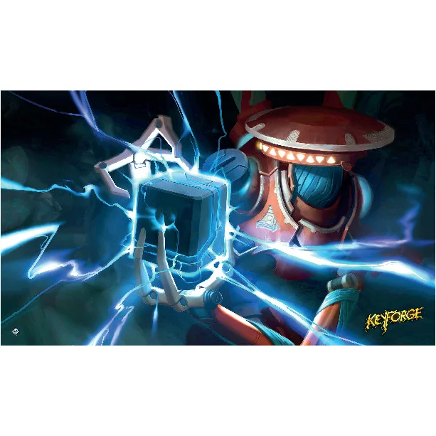 Field your spectacular clashes in style with the Positron Bolt Playmat for KeyForge: Call of the Archons! Whether you are participating in a high-caliber tournament or simply playing around the kitchen table, this high-quality playmat presents your cards in stunning fashion, featuring rich art from the expansive and enigmatic world of KeyForge. This 24” x 14” mat provides the perfect play surface to protect your cards from stains and spills, keeping the focus on your adventures in the Crucible. Displaying an electric art piece to embrace your Logos pride, this mat keeps your chaotic clashes both organized and immersive.