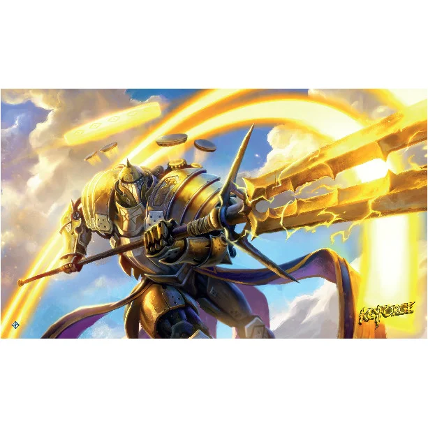 Pledge yourself to the House of Sanctum with the Raiding Knight Playmat, featuring an ethereal art piece revealing a celestial warrior. The angelic knights and crusaders of this House keep their home on the Crucible safe, clean, and pleasant—a rare thing on the planet. Floating on golden wings, these warriors protect the weak and defend the innocent. Of course, what is “right” and “just” is determined by the leaders of their own House, but in their infinite wisdom, their motives are surely pure.