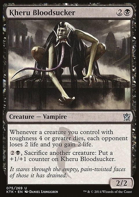 Whenever a creature you control with toughness 4 or greater dies, each opponent loses 2 life and you gain 2 life. {2}{B}, Sacrifice another creature: Put a +1/+1 counter on Kheru Bloodsucker.