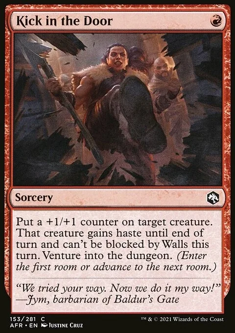 Put a +1/+1 counter on target creature. That creature gains haste until end of turn and can't be blocked by Walls this turn. Venture into the dungeon. (Enter the first room or advance to the next room.)