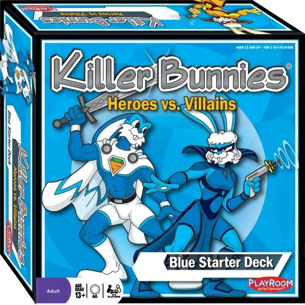 Killer Bunnies: Heroes vs. Villains - Blue Starter Deck is a standalone game in the Killer Bunnies universe. Drawing and playing cards from a shared deck, players may choose to be a defender of goodness, courageousness and virtue by playing the Hero Super Bunnies or a generator of chaos, evilness and deceit by playing the Villain Super Bunnies. Whoever they are, the players use their bunnies' powers to build cities, attack opponents, and protect themselves. The first player who has a predetermined number of bunnies in the Bunny Circle and cities in the City Circle wins!