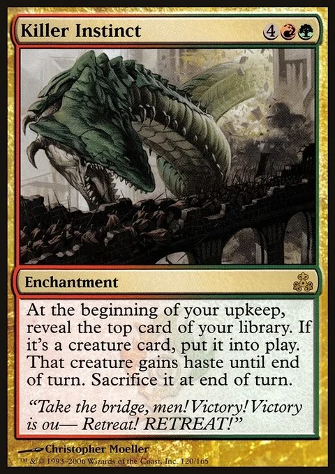 At the beginning of your upkeep, reveal the top card of your library. If it's a creature card, put it onto the battlefield. That creature gains haste until end of turn. Sacrifice it at the beginning of the next end step.