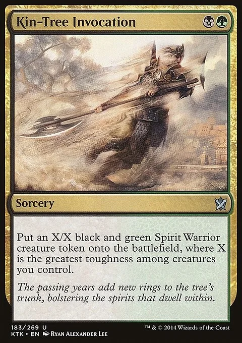 Create an X/X black and green Spirit Warrior creature token, where X is the greatest toughness among creatures you control.