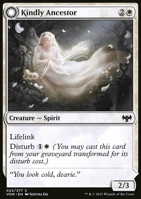 Kindly Ancestor Lifelink Disturb {1}{W} (You may cast this card from your graveyard transformed for its disturb cost.) Ancestor's Embrace Enchant creature Enchanted creature has lifelink. If Ancestor's Embrace would be put into a graveyard from anywhere, exile it instead.