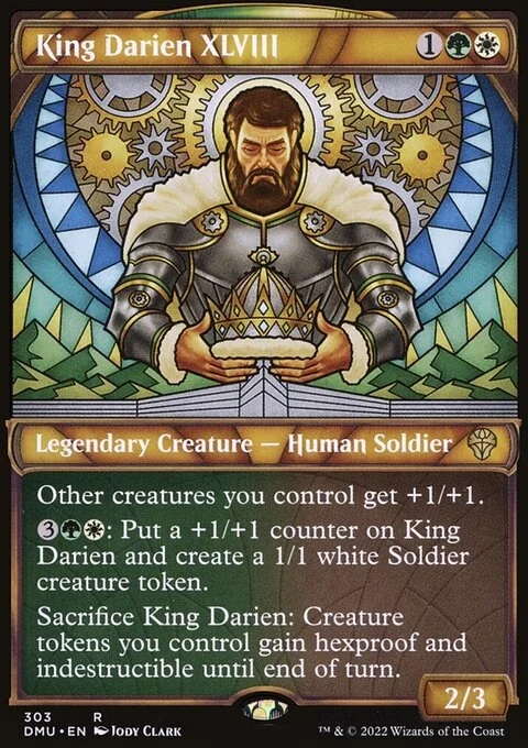 Other creatures you control get +1/+1. {3}{G}{W}: Put a +1/+1 counter on King Darien and create a 1/1 white Soldier creature token. Sacrifice King Darien: Creature tokens you control gain hexproof and indestructible until end of turn.