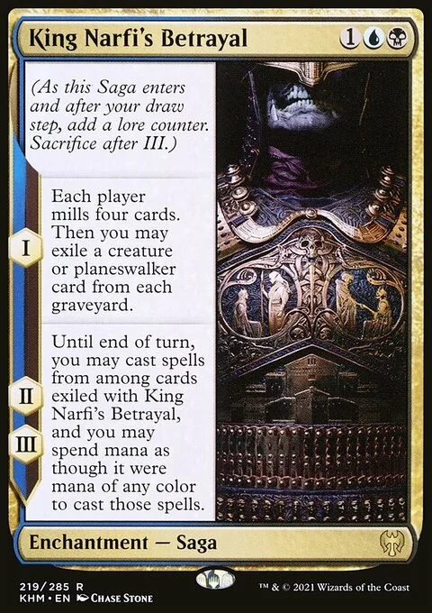 II, III — Until end of turn, you may cast spells from among cards exiled with King Narfi's Betrayal, and you may spend mana as though it were mana of any color to cast those spells.