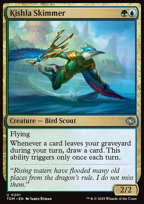 Flying Whenever a card leaves your graveyard during your turn, draw a card. This ability triggers only once each turn.