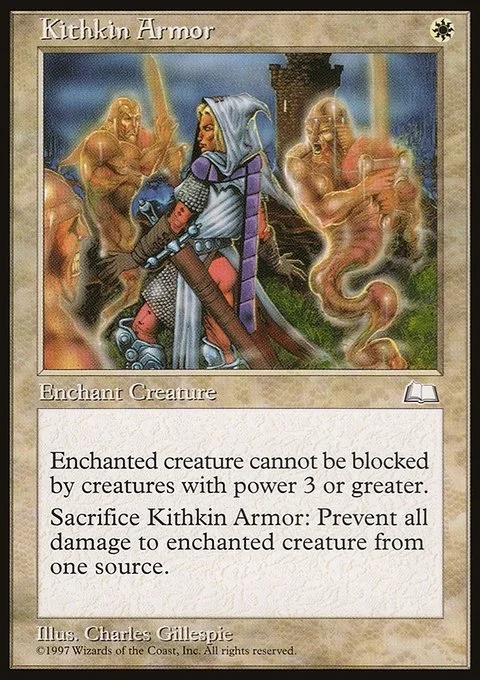 Enchant creature Enchanted creature can't be blocked by creatures with power 3 or greater. Sacrifice Kithkin Armor: The next time a source of your choice would deal damage to enchanted creature this turn, prevent that damage.