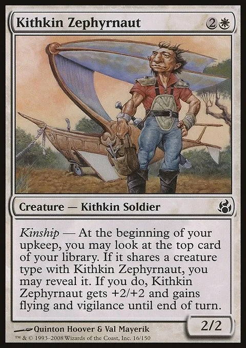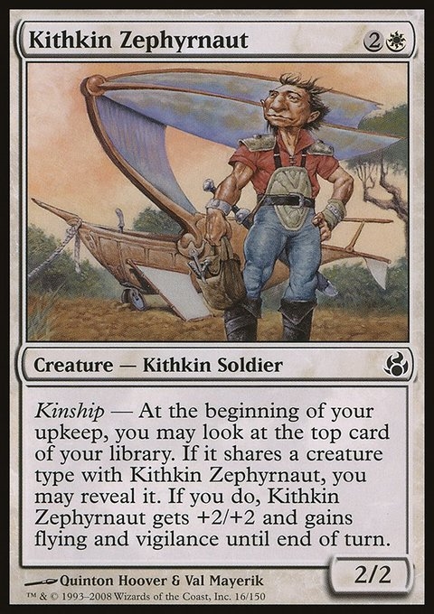 Kinship — At the beginning of your upkeep, you may look at the top card of your library. If it shares a creature type with Kithkin Zephyrnaut, you may reveal it. If you do, Kithkin Zephyrnaut gets +2/+2 and gains flying and vigilance until end of turn.