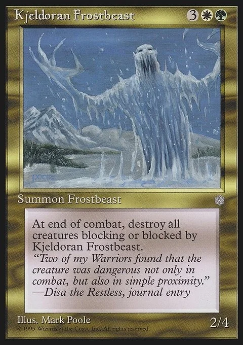 At end of combat, destroy all creatures blocking or blocked by Kjeldoran Frostbeast.
