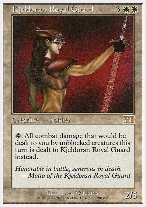 T: All combat damage that would be dealt to you by unblocked creatures this turn is dealt to Kjeldoran Royal Guard instead.