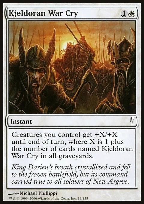 Creatures you control get +X/+X until end of turn, where X is 1 plus the number of cards named Kjeldoran War Cry in all graveyards.