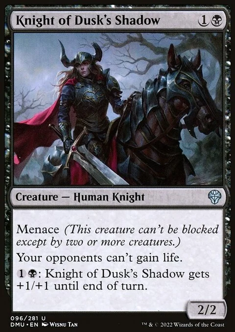 Menace (This creature can't be blocked except by two or more creatures.) Your opponents can't gain life. {1}{B}: Knight of Dusk's Shadow gets +1/+1 until end of turn.