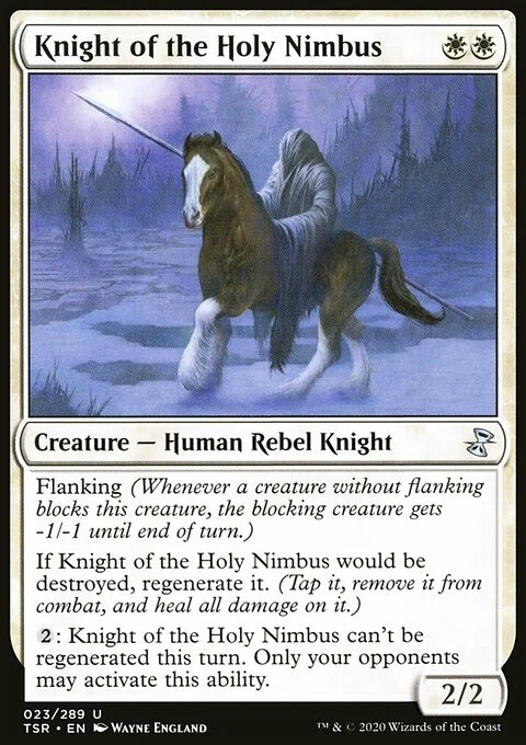 Flanking (Whenever a creature without flanking blocks this creature, the blocking creature gets -1/-1 until end of turn.) If Knight of the Holy Nimbus would be destroyed, regenerate it. (Tap it, remove it from combat, and heal all damage on it.) {2}: Knight of the Holy Nimbus can't be regenerated this turn. Only your opponents may activate this ability.
