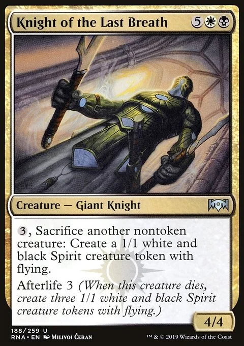 {3}, Sacrifice another nontoken creature: Create a 1/1 white and black Spirit creature token with flying. Afterlife 3 (When this creature dies, create three 1/1 white and black Spirit creature tokens with flying.)