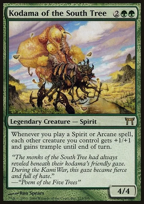 Whenever you cast a Spirit or Arcane spell, each other creature you control gets +1/+1 and gains trample until end of turn.