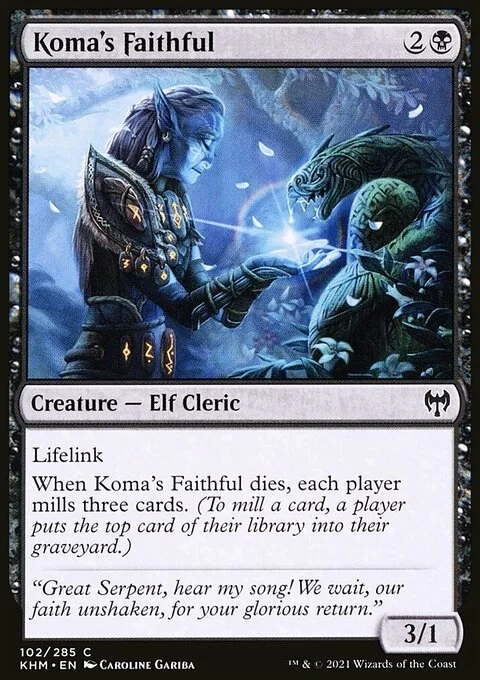 Lifelink When Koma's Faithful dies, each player mills three cards. (To mill a card, a player puts the top card of their library into their graveyard.)