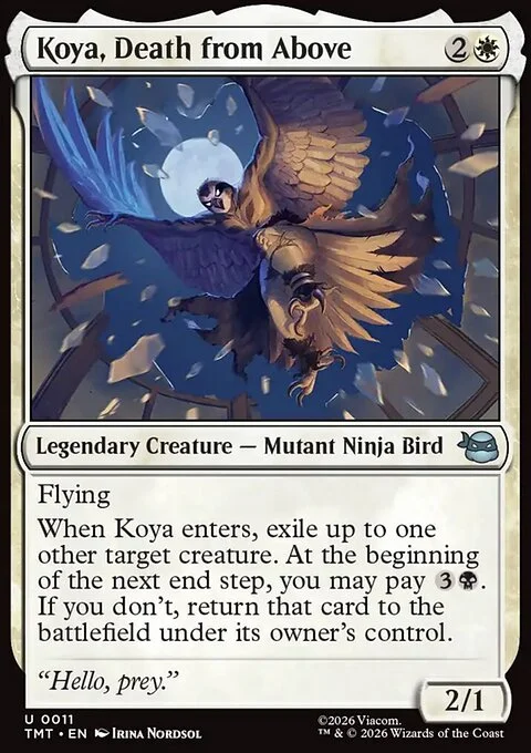 Flying When Koya enters, exile up to one other target creature. At the beginning of the next end step, you may pay {3}{B}. If you don't, return that card to the battlefield under its owner's control.