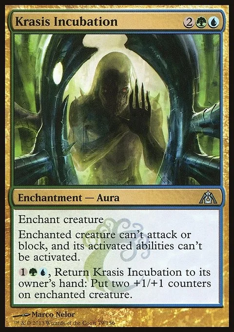 Enchant creature Enchanted creature can't attack or block, and its activated abilities can't be activated. {1}{G}{U}, Return Krasis Incubation to its owner's hand: Put two +1/+1 counters on enchanted creature.