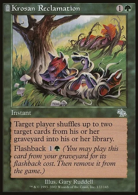 Target player shuffles up to two target cards from their graveyard into their library. Flashback {1}{G} (You may cast this card from your graveyard for its flashback cost. Then exile it.)
