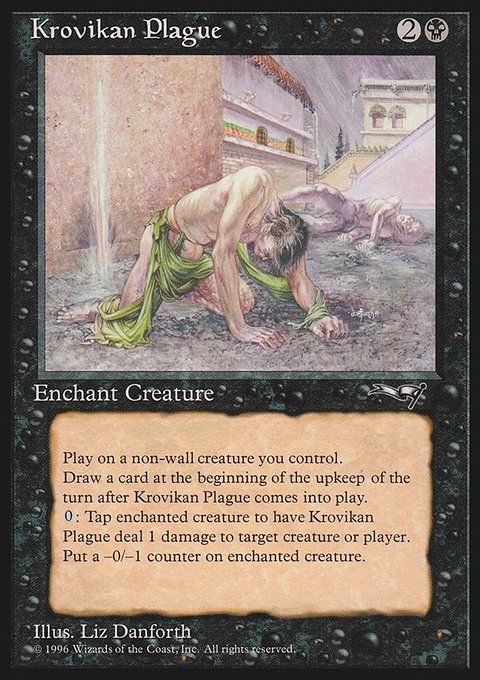 Play on a non-wall creature you control.Draw a card at the beginning of the upkeep of the turn after Krovikan Plague comes into play.0: Tap enchanted creature to have Krovikan Plague deal 1 damage to target creature or player. Put a -0/-1 counter on enchanted creature.