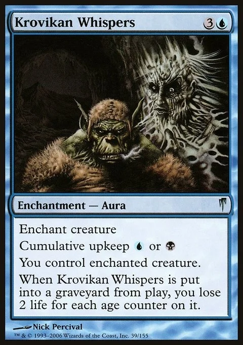 When Krovikan Whispers is put into a graveyard from the battlefield, you lose 2 life for each age counter on it.