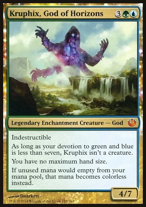 Indestructible As long as your devotion to green and blue is less than seven, Kruphix isn't a creature. You have no maximum hand size. If you would lose unspent mana, that mana becomes colorless instead.