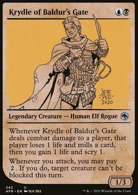 Whenever Krydle of Baldur's Gate deals combat damage to a player, that player loses 1 life and mills a card, then you gain 1 life and scry 1. Whenever you attack, you may pay {2}. If you do, target creature can't be blocked this turn.