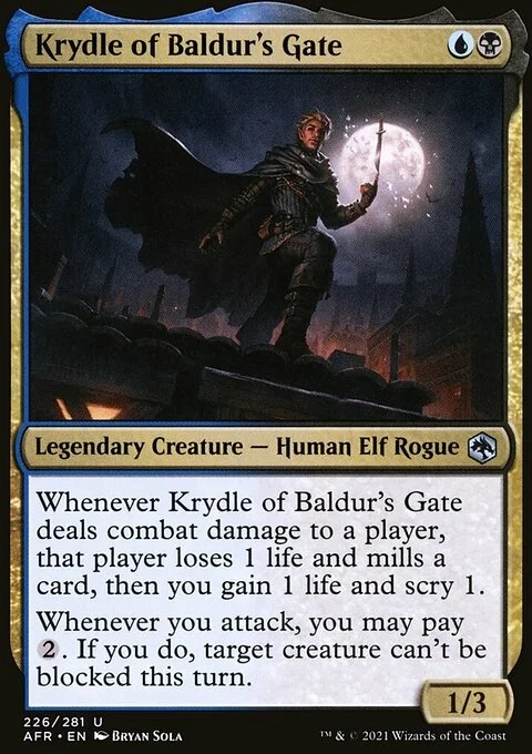 Whenever Krydle of Baldur's Gate deals combat damage to a player, that player loses 1 life and mills a card, then you gain 1 life and scry 1. Whenever you attack, you may pay {2}. If you do, target creature can't be blocked this turn.