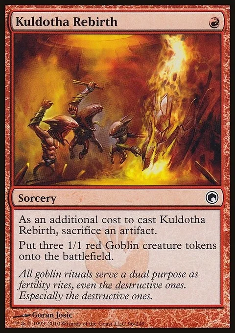 As an additional cost to cast this spell, sacrifice an artifact. Create three 1/1 red Goblin creature tokens.