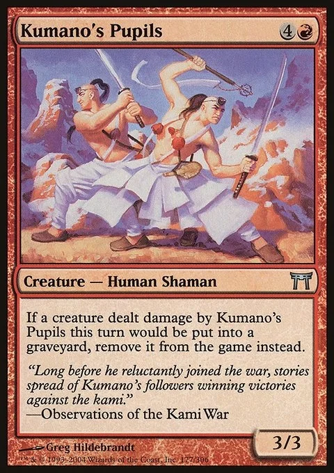 If a creature dealt damage by Kumano's Pupils this turn would die, exile it instead.