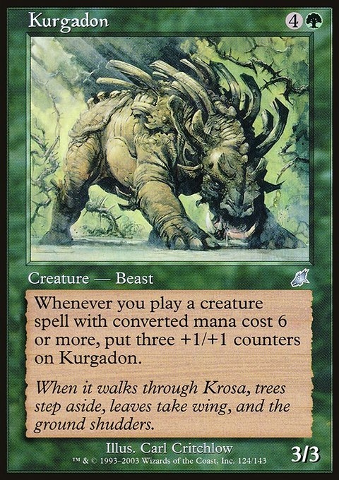 Whenever you play a creature spell with converted mana cost 6 or more, put three +1/+1 counters on Kurgadon.