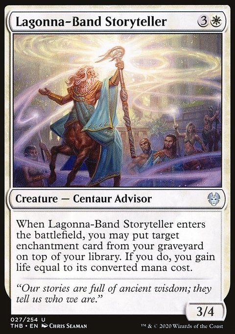 When Lagonna-Band Storyteller enters the battlefield, you may put target enchantment card from your graveyard on top of your library. If you do, you gain life equal to its mana value.